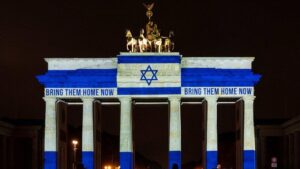 Berlin Senatosu, 7 Ekim 2023 saldırılarında hayatını kaybedenleri anmak ve hâlâ Hamas’ın elinde rehin tutulan kişilere dikkat çekmek amacıyla Brandenburg Kapısı’nı İsrail bayrağının renkleriyle aydınlattı.