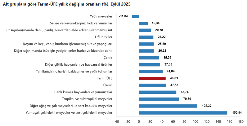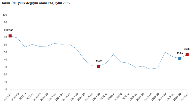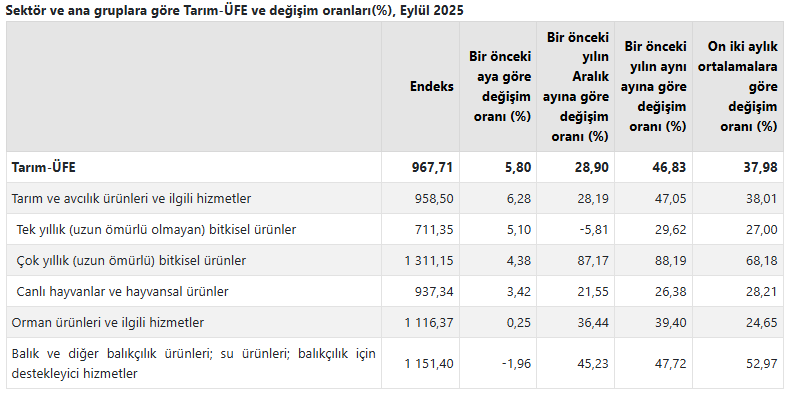 Türkiye İstatistik Kurumu (TÜİK), 2025 yılı Eylül ayına ilişkin tarım ürünleri üretici fiyat endeksi (Tarım-ÜFE) verilerini açıkladı. Buna göre, Tarım-ÜFE’de (2020=100), 2025 yılı Eylül ayında bir önceki aya göre yüzde 5,80 artış, bir önceki yılın Aralık ayına göre yüzde 28,90 artış, bir önceki yılın aynı ayına göre yüzde 46,83 artış ve on iki aylık ortalamalara göre yüzde 37,98 artış gerçekleşti.